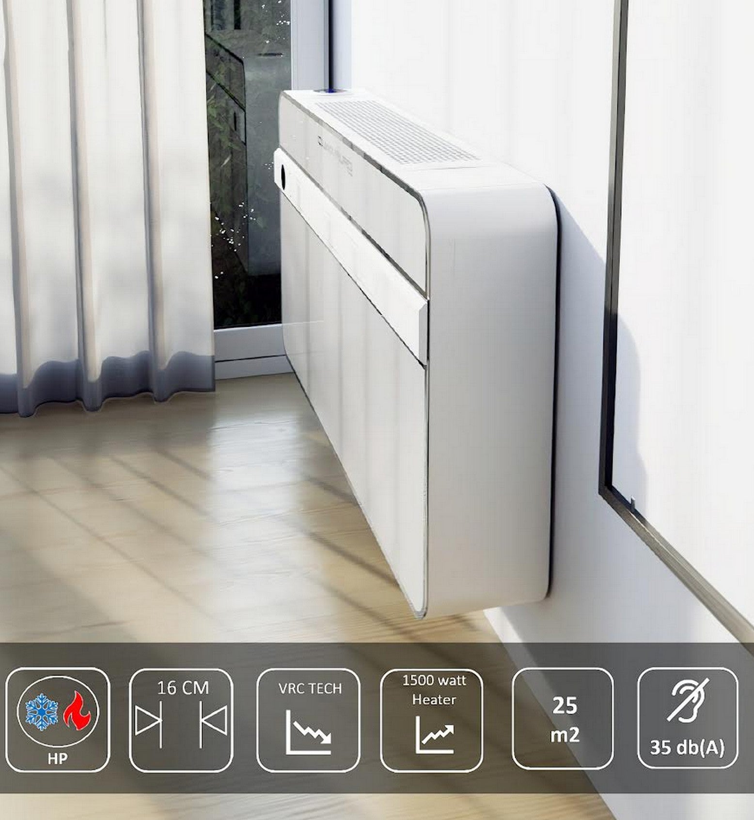 Climatiseur sans unité extérieure avec technologie Full DC Inverter. Design élégant, silencieux et idéal pour des espaces jusqu'à 25 m². Chauffage, refroidissement et purification de l'air en un seul appareil !